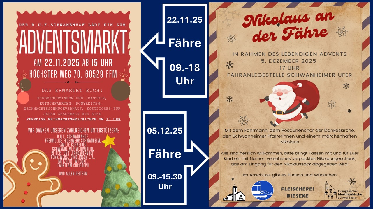 Donnerstag, 20.11.25 09.00-17.00 Uhr Freitag, 21.11.25 09.00-17.00 Uhr Samstag, 22.11.25 09.00-18.00 Uhr Weihnachtsmarkt-Schwanhof https://mainfaehrefrankfurt.de/wp-content/uploads/2025/10/Ohne-Titel-1.mp4