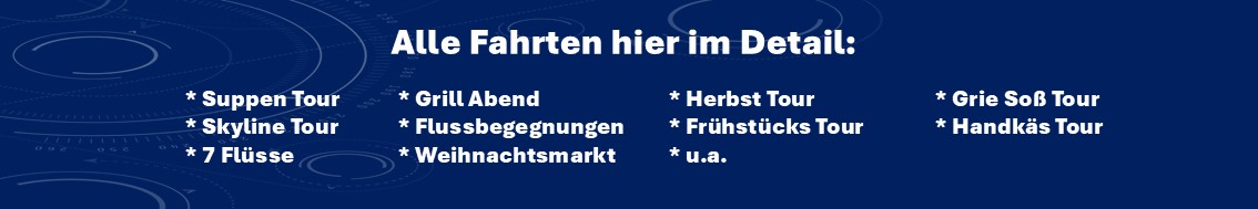 A boat trip is fun, a boat trip is beautiful – especially when there is still Stöffche on the boat. Join us on a boat trip with Handkäs and Ebbelwoi. The trip starts in the far west of Frankfurt at the landing stage of the only ferry in the city, the “Walter Kolb”, very close to Höchster Schloss. When the ship departs and the supplies are ready, participants can expect two different variations from the Handkäs‘ Shop program and delicious apple wine from regional production, as well as a boat trip towards Frankfurt’s Osthafen. Learn interesting facts about the two Frankfurt cultural assets and the local inland waterways. Highlights of this trip are definitely the passage at the Griesheim barrage and the view of the Frankfurt skyline. Departure: 19.00 hrs Schwanheim/Höchst End: approx. 22.00 hrs Schwanheim/Höchst (depending on the lock) Fare € 79,00 -Reservation required! Book here: